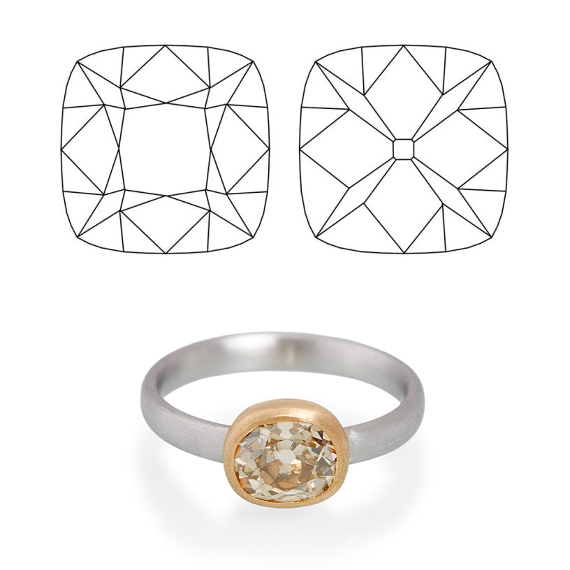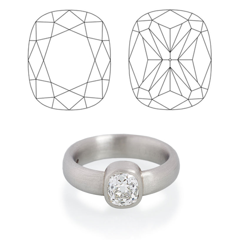 Traditional Cushion Cut diamonds, often referred to as antique cushions, chunky cushions or cushion brilliants—return light in a chunkier pattern than modern cut diamonds. While generally less brilliant than round Brilliant Cut diamonds, Cushion Cut diamonds often have greater ‘fire’. Combined with a larger culet (considered desirable for the pattern created when viewed through the table), these qualities of the traditional cushion cut create a distinctive look that’s coverted today among gem dealers.